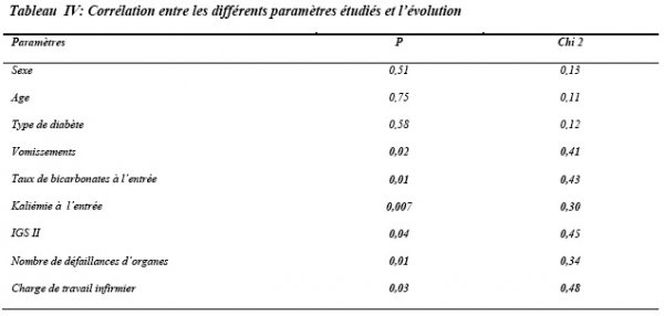 Il y’avait une forte corrélation avant l’admission, entre le taux de bicarbonates donc la sévérité de l’acidose à l’entrée, la kaliémie, la gravité évaluée par l’IGS II, le nombre de défaillance d’organe et la charge de travail infirmier d’une part et l’évolution de nos patients d’autre part (tableau IV).