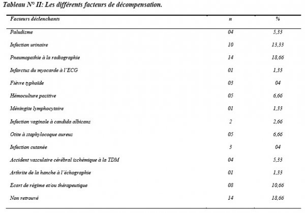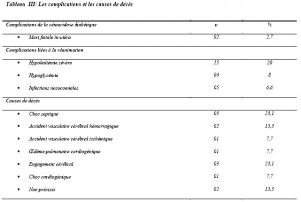 Au cours de l’hospitalisation, 22 patients (29,3%) avaient présenté des complications, dont 2,7% étaient directement liées à la céto-acidose et les 26,6% liées à la réanimation. Treize décès (17,3%) étaient enregistrés (tableau III).