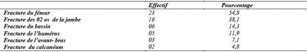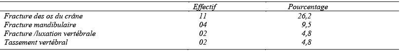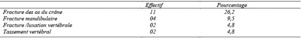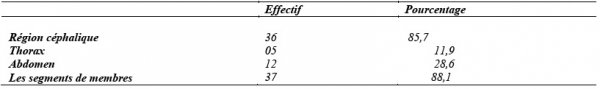 Dans notre étude, 76,2 % des patients provenaient directement des lieux de l’accident et 23,8 % ont été référés d’un centre de santé après les premiers soins. 73,8 % des patients avaient été transportés par les sapeurs pompiers, 23,8 % par les véhicules de transport en commun et le transport médicalisé avait été assuré pour 2,4 % des patients. Les accidents de la voie publique étaient la cause la plus fréquente : 90,4 % des cas, 4,8 % étaient victimes d’agression physique (coups et blessures volontaires à l’arme blanche) et les catastrophes naturelles (éboulement et chute de tronc d’arbre sur le corps) étaient notées dans 4,8 % des cas. 83,3 % des patients avaient présenté une détresse cardiocirculatoire, 71,4% une détresse neurologique et 50 % une détresse respiratoire. Le tableau I indique la répartition des patients en fonction des régions anatomiques atteintes.