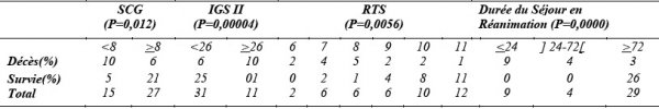 La durée moyenne de l’hospitalisation en réanimation était de 7,5 ± 5,8 jours avec des extrêmes de 1 jour et 42 jours. L’évolution était favorable dans 61,9% des cas et 38,1% des polytraumatisés étaient décédés. Parmi les 26 survivants, 26,9 % avaient présenté des complications (une infection des voies urinaires chez 3 patients, des escarres fessières dans 3 cas et chez 2 patients une suppuration pariétale post opératoire. Le tableau VI expose la répartition de la mortalité des patients en fonction du score de Glasgow, de l’Indice de Gravité Simplifié II (IGS II), duRevised Trauma Score (RTS) et de la durée du séjour en réanimation.