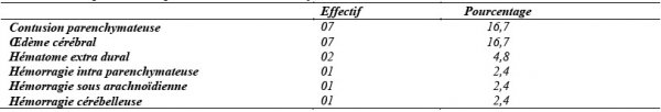 26,2 % des polytraumatisés avaient bénéficié d’une scannographie cérébrale. Les lésions cérébrales objectivées sont répertoriées dans le tableau IV.
