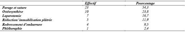 Aucun patient n’a bénéficié d’une prise en charge préhospitalière au cours de la période d’étude. En milieu hospitalier la prise en charge comportait le traitement des différentes détresses vitales et la réalisation des gestes chirurgicaux. En urgence, une mise en condition était réalisée et comprenait un abord veineux périphérique ou central selon le cas, la mise en place d’une sonde vésicale et d’une sonde nasogastrique. La prise en charge des détresses cardiocirculatoires avait été assurée en urgence par un remplissage vasculaire avec les cristalloïdes dans 83,3 %, avec du sang et dérivés sanguins dans 62,9 % des cas et avec les colloïdes dans 28,6 % des cas. Une libération des voies aériennes supérieures par aspiration a été a réalisée chez 50 % des patients et 23,80 % ont été intubés. Tous les patients ont bénéficié d’une oxygénothérapie, 4,8 % ont été mis sous respirateur mécanique et 4,8 % ont bénéficié d’un drainage pleural pour hémothorax. Le traitement de la douleur a été réalisée chez tous les patients à l’aide des antalgiques (paracétamol seul ou associé à du tramadol selon le cas). Une antibiothérapie était instituée de façon systématique. Un traitement spécifique en fonction du diagnostic lésionnel était entrepris en réanimation avant le transfert vers le bloc opératoire (Tableau V).