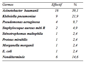 Les principaux germes isolés au cours de ces pneumopathies étaient essentiellement l’Acinétobacter baumanii et le Klebsiella pneumoniae avec respectivement 39% et 22%. Dans 15% des cas, elles étaient indéterminées, et quelques cas de co-infections avaient été notés. Au sein de cette flore bactérienne, 63,15% étaient des bactéries multirésistantes (BMR). (Tableau IV).