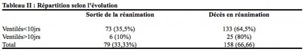 Par contre l’évolution défavorable équivalait au décès du patient pendant la période de ventilation, soit 66,66% (la létalité des patients ventilés au-delà de 10 jours était de 80%).