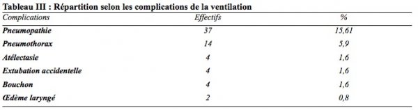 Les pneumopathies nosocomiales acquises sous ventilation mécanique représentaient la majorité des complications (15,6 %). Venaient ensuite les barotraumatismes représentés par lepneumothorax (5,9 %.) Les atélectasies, les bouchons de sonde, et les extubations accidentelles se partageaient chacune 1,6% (Tableau III).
