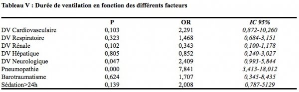 La survenue d’un barotraumatisme au cours de la ventilation mécanique (p=0,624) n’influençait pas la durée de celle-ci. Il en était de même d’une sédation supérieure à 24h (p=0,139) (Tableau V).