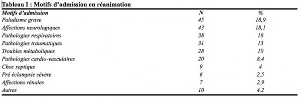 La sévérité des défaillances neurologiques et/ou respiratoires qui accompagnent souvent certaines affections comme le paludisme grave, les maladies neurologiques, respiratoires et traumatiques pourrait expliquer le fait qu’elles soient les premiers motifs de ventilation mécanique dans notre étude.