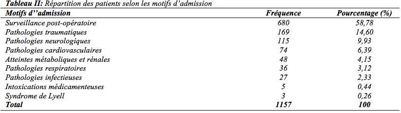 Les motifs d’admission étaient dominés par les nécessités de soins post opératoires (58,77%), suivies des pathologies traumatiques (14,60%), les affections neurologiques et cardiovasculaires représentaient respectivement 9,93% et 6,39%. On note 0,43 % d’intoxications médicamenteuses. (Tableau II).