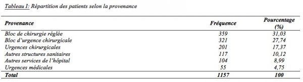 Les patients provenaient de différents services avec une prédominance du bloc opératoire (58,77%), des urgences chirurgicales (17,37%). 10,11% des patients étaient des admissions directes et 4,75% venaient du service des urgences médicales (Tableau I).