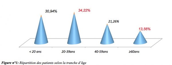 Notre étude a concerné 1157 patients admis dans le service de réanimation. L’âge moyen était de 34,63+/-23,37 ans avec des extrêmes allant de 6 mois à 103 ans. Le sexe masculin prédominait avec 62,22%, soit un sexe ratio de 1,6. La tranche d’âge la plus représentée était celle de 20-39 ans avec 34,22% des cas, suivie des moins de 20 ans avec 30,94% des cas. Les sujets âgés de plus de 60 ans représentaient 13,56%. (Figure n°1)