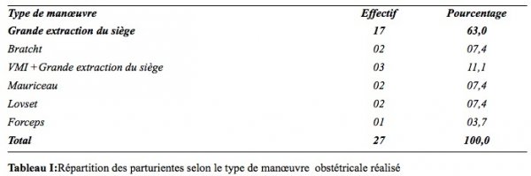 Le J2 était en présentation céphalique dans 60,6 % des cas (n=117). La présentation de siège était retrouvée dans 35,2 % des cas et la présentation transversale dans 4,2% des cas. Dans notre étude, l’usage d’ocytocique injectable n’a pas été nécessaire dans 91,2% des cas pour l’accouchement du deuxième jumeau. La plupart des accouchements du deuxième jumeau s’était effectuée par voie basse (51,3%) des cas (n=99) ; dont 14% après manœuvre obstétricale et 37,3% sans manœuvre. Les manœuvres sont listées dans le tableau I