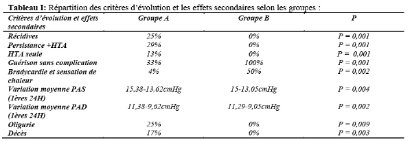 Le score de Glasgow était < à 8 à l’examen sous traitement chez 12,50 % des patientes du groupe A contre zéro pourcent dans le groupe B. Au besoin, le remplissage était assuré avec des cristalloïdes. Dix-sept pour cent des patientes du groupe A étaient décédées contre zéro pourcent des patientes du groupe B (P = 0,037).