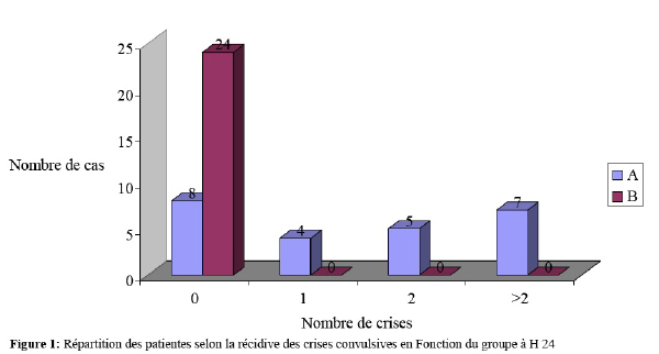 sur une période d’étude s’étendant de novembre 2005 à avril 2006 ; 48 patientes étaient randomisées en deux groupes en réanimation. Durant la même période 334 patients étaient hospitalisés soit une fréquence de 14,40 % de cas d’éclampsie. Les deux groupes étaient comparables, en ce qui concerne l’âge (âge moyen de 19 ans avec des extrêmes de 15 et 25 ans), le niveau d’instruction, la parité, la gestité, le statut matrimonial et la profession. Dans les deux groupes 2% des patientes avaient des antécédents d’hypertension artérielle (HTA). Soixante-neuf pourcent des éclampsies survenaient en prépartum. Soixante-cinq pourcent des grossesses étaient à terme. Deux pourcent des patientes avaient effectué un nombre de consultation prénatale ≥ 4. A l’admission 83 % des patientes présentaient une altération de la conscience. Les critères d’une bonne évolution sous traitement et les effets secondaires étaient en faveur des patientes du groupe B (Tableau I).