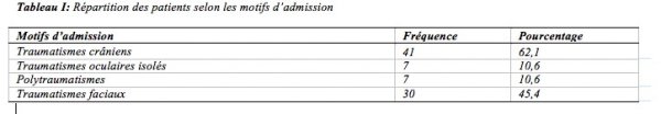 Les traumatismes crâniens (62%) et/ou faciaux (45%) représentaient les motifs d’admission les plus fréquents aux urgences chez les patients présentant un traumatisme oculaire (tableau I).