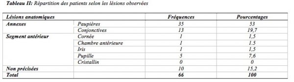 Sur le plan clinique, le traumatisme oculaire était unilatéral chez 51 patients (77,3%) et bilatéral chez 15 patients (22,7%). L’œil gauche était atteint dans 63,4% des cas et l’œil droit dans 59,1%. Dans la majorité des cas (98,5%), il s’agissait de traumatisme à globe fermé. Un seul cas de traumatisme à globe ouvert avait été enregistré. Les lésions anatomiques intéressaient plus fréquemment les annexes (tableau II).