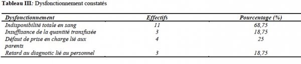 La transfusion sanguine a démarré avec un retard considérable, excédant les 30 minutes pour les 3 patientes bénéficiaires, 2 patientes sont décédées avant la mise en route de la transfusion.