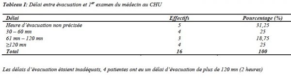 Les patientes avaient été évacuées en ambulance dans 43,7% des cas (7/16). Les motifs d’évacuation étaient dominés par l’hémorragie de la délivrance (6/16), l’anémie décompensée (3/16) et le placenta abruptio ou HRP (3/16).